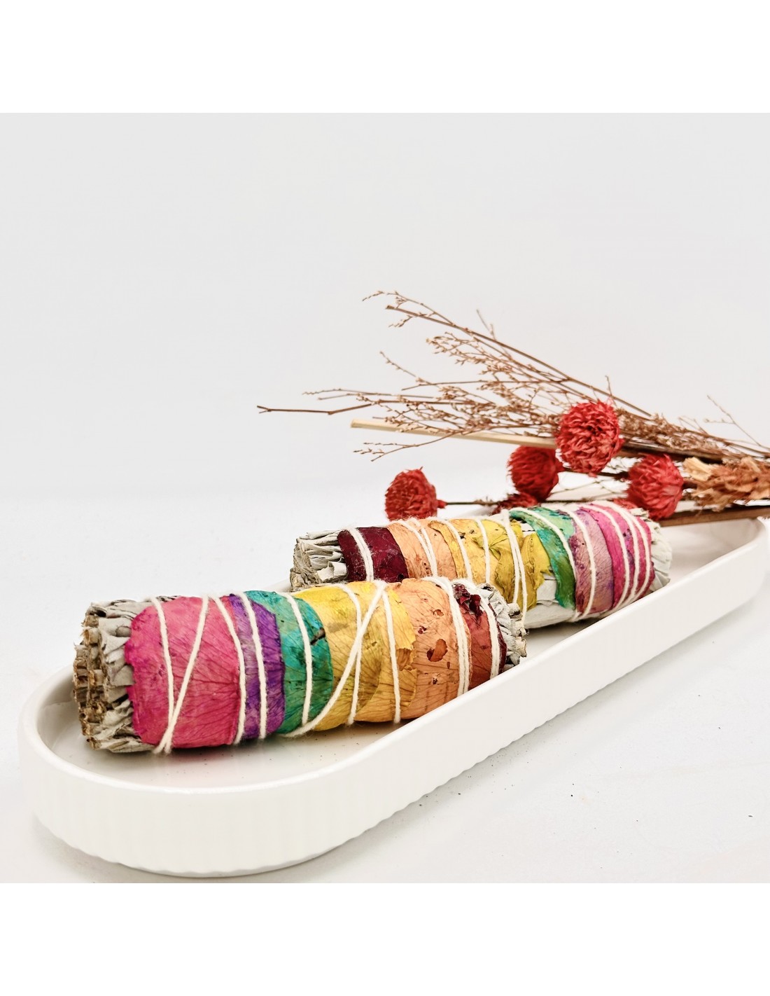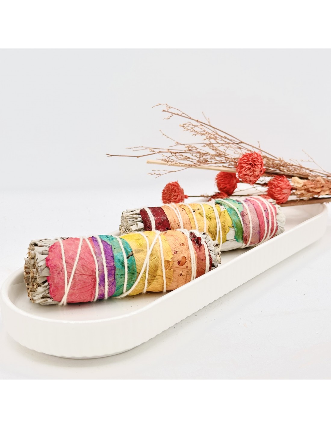 La salvia blanca se utiliza tradicionalmente para limpiar y purificar los ambientes, alejando energías densas y aportando frescura y renovación. Los pétalos de los 7 chakras, cuidadosamente dispuestos, añaden color, energía y equilibrio, activando cada centro energético: