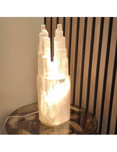 La selenita, un cristal que actúa disolviendo densidades y restableciendo la armonía, manifiesta en este modelo una fuerza aún más acentuada. La configuración en dos torres eleva la vibración de manera vertical, funcionando como un canal que conecta el espacio con los planos superiores y facilita inspiración intuitiva, percepción expandida y estados meditativos profundos. La luz blanca atraviesa las capas del cristal creando un campo de silencio interior que calma la mente y estabiliza las emociones.
