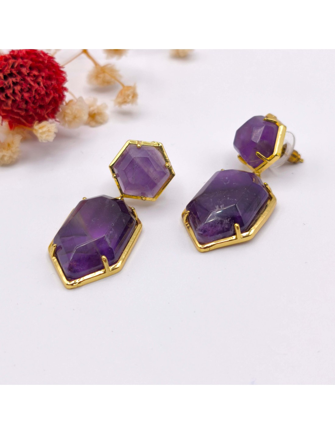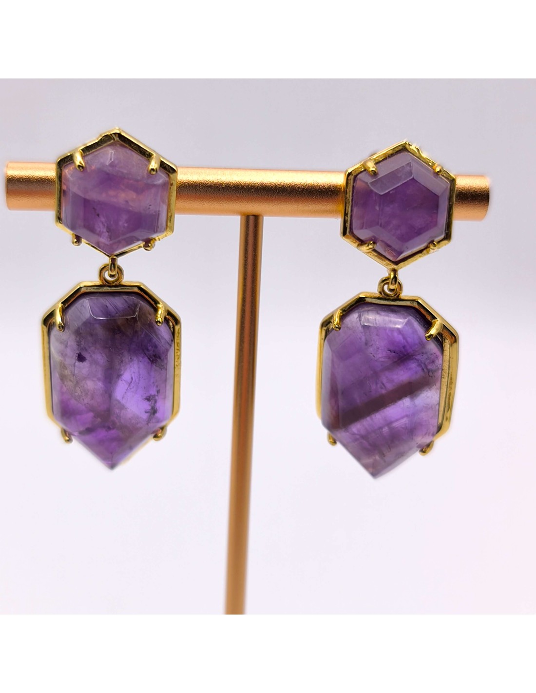 Os brincos de ametista emanam uma energia de proteção espiritual, equilíbrio emocional e clareza intuitiva. A sua vibração atua próxima do campo mental, trazendo serenidade, foco interior e uma elevação sutil da consciência ao longo do dia.