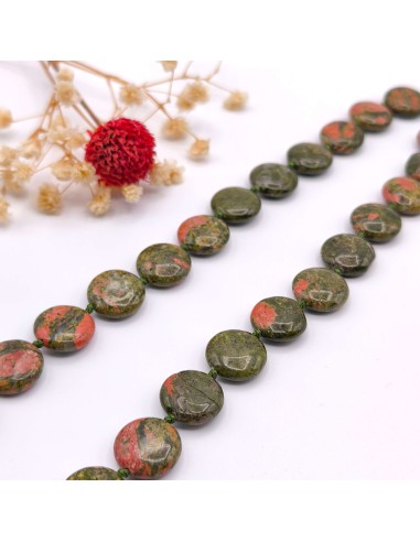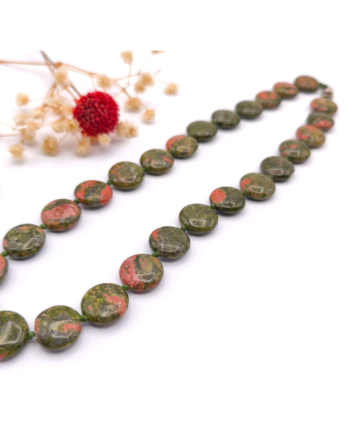 La Unakita es una mezcla de Epidoto con jaspe, una piedra especial con energía capaz de ayudarnos a mantener el equilibrio entre el mundo espiritual y físico, una piedra de visión que equilibra las emociones y la espiritualidad.