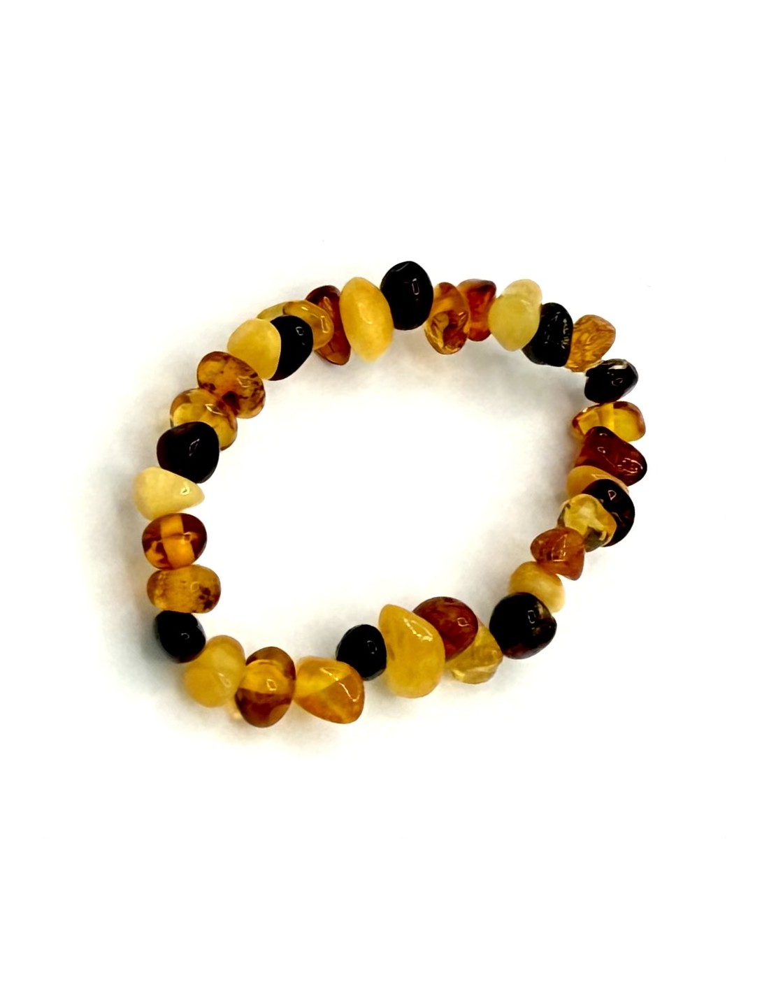 Pulsera de ámbar infantil multicolor con formas suaves para confort energético, protección natural y equilibrio emocional.