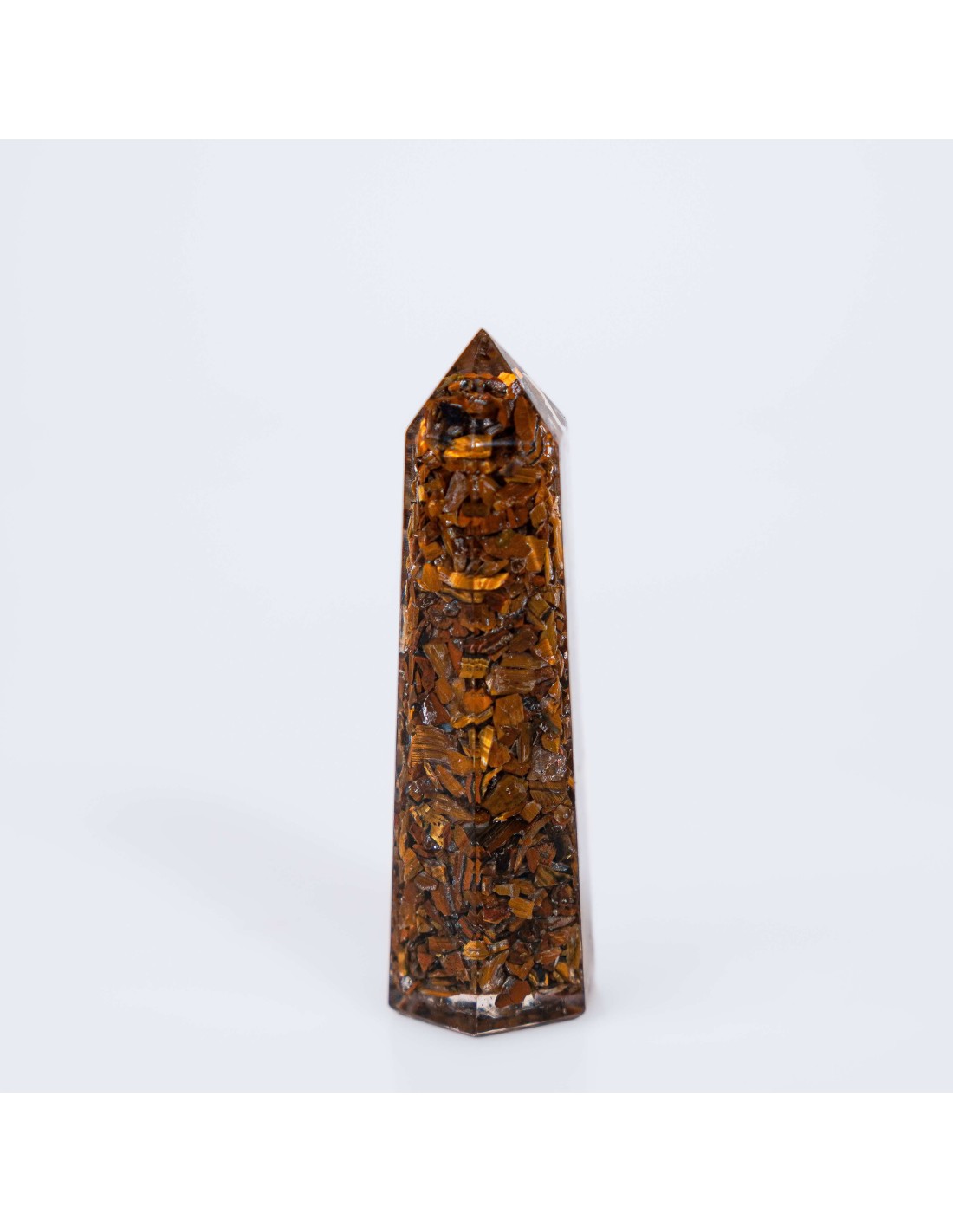 Integrado en la estructura de la orgonita, el ojo de tigre mantiene un flujo continuo de armonización vibracional. La forma de generador amplifica y dirige esta energía, creando un campo de protección en el ambiente donde se coloca. Actúa en la limpieza energética del espacio, transformando vibraciones densas en energía más estructurada, fuerte y equilibrada.