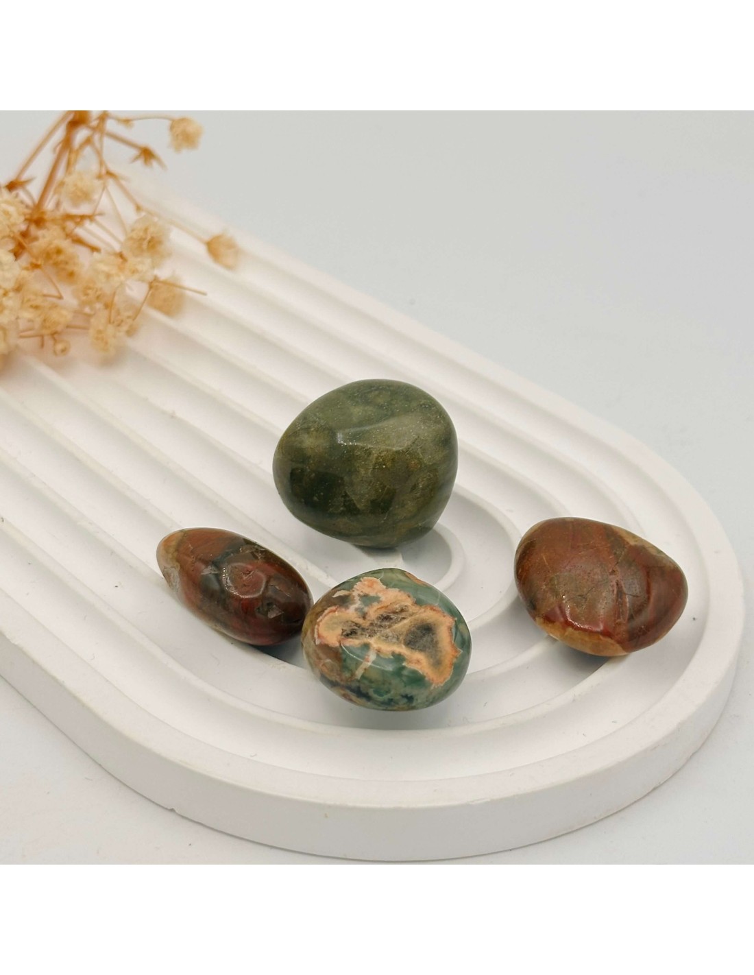 Sus tonalidades verdes y terrosas reflejan crecimiento, vitalidad y regeneración. La riolita guía en el despertar espiritual, promoviendo equilibrio, gratitud y conexión profunda con la Tierra.