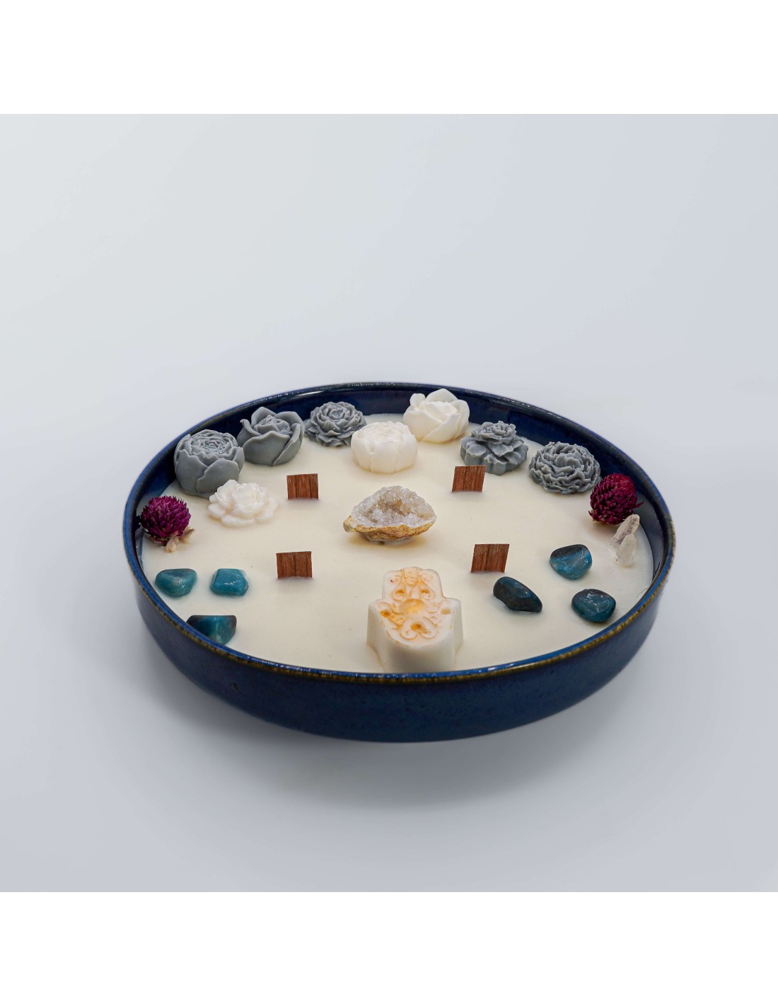 En el centro se encuentra la geoda de Cuarzo Cristal, que actúa como amplificador natural de intención y vibración. Su presencia potencia la energía de la vela, fortalece la claridad interior y favorece limpieza energética sutil. Ayuda a elevar la frecuencia del espacio y a organizar el campo vibracional.