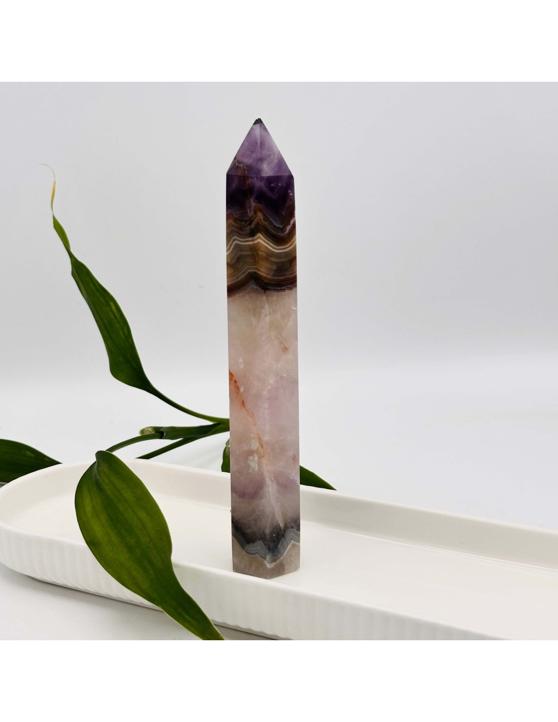 O gerador, pela sua forma, concentra e direciona a energia para o alto. Funciona como um canal que purifica, eleva e amplifica intenções, tornando-se um ponto de luz nos momentos em que precisas de clareza e ligação ao teu eixo espiritual. A Ametista, cristal do chakra do terceiro olho e do chakra coronário, atua acalmando a mente, silenciando ruídos internos e abrindo espaço para perceções intuitivas mais profundas. A sua vibração dissolve tensões, ilumina emoções escondidas e guia-te para uma compreensão mais elevada do teu caminho.