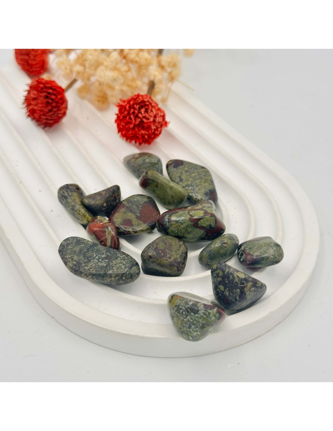 Trata-se de uma calcedônia verde que contém presença de ferro, que se acentua em forma de pontos vermelhos, formando uma linda pedra.
