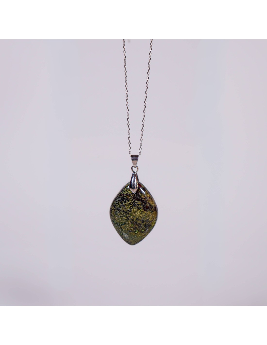 Do ponto de vista mineralógico, trata-se de uma variedade de jaspe composta essencialmente por quartzo microcristalino com inclusões de minerais ricos em ferro e epidoto, responsáveis pelas tonalidades verdes e manchas vermelhas características. Forma-se em ambientes sedimentares e metamórficos, onde processos geológicos de pressão e mineralização criam o seu padrão intenso e contrastante. A presença de ferro na sua composição reforça simbolicamente a sua associação à força e resistência.