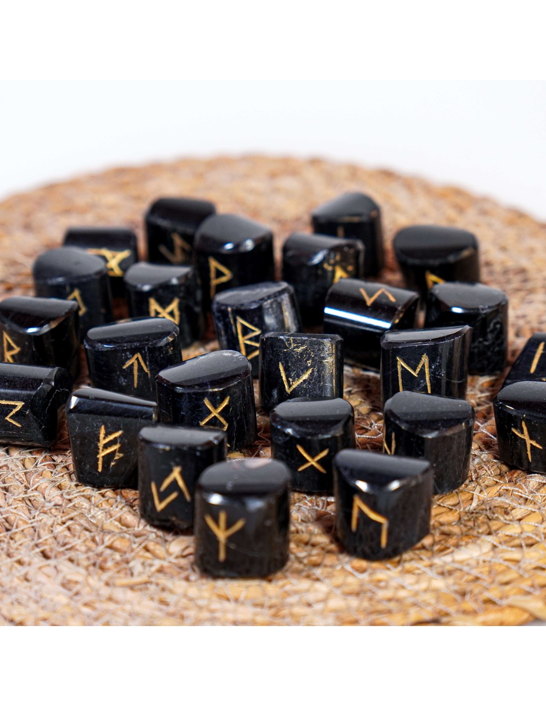 Conjunto de runas gravadas em turmalina negra para práticas de leitura e orientação espiritual. Cada símbolo representa arquétipos ancestrais utilizados para reflexão, direção e tomada de decisões.