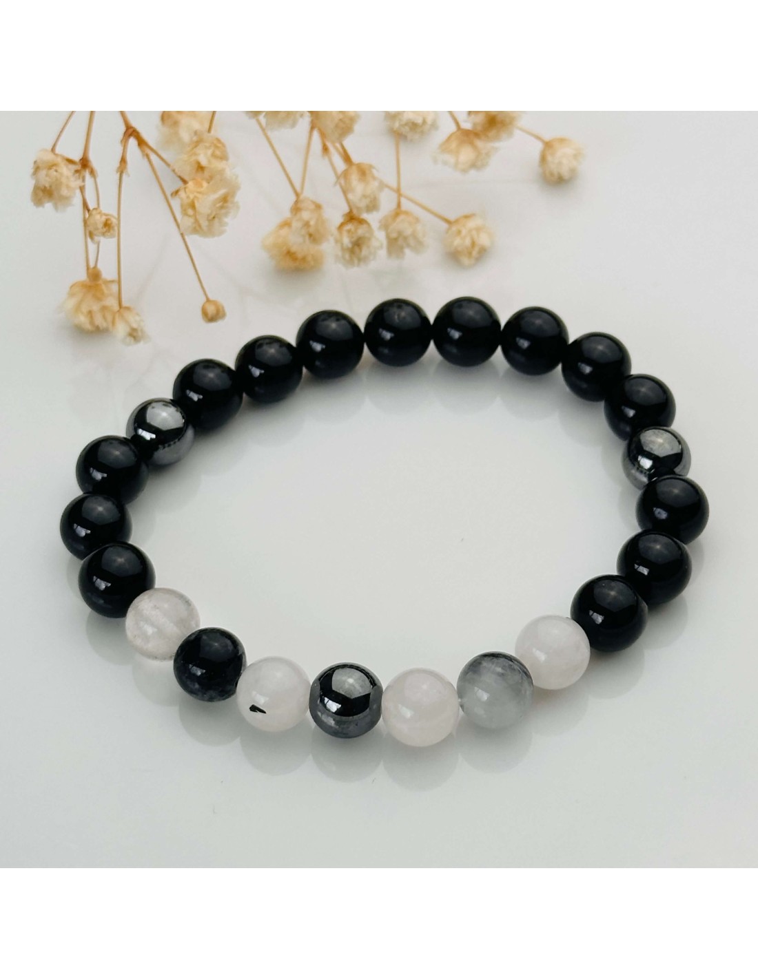 A união da turmalina negra, do quartzo turmalinado e da hematite cria um campo energético altamente protetor, estável e enraizador. Esta combinação foi pensada para reforçar limites energéticos, neutralizar energias densas e promover uma sensação contínua de segurança, presença e força interior.