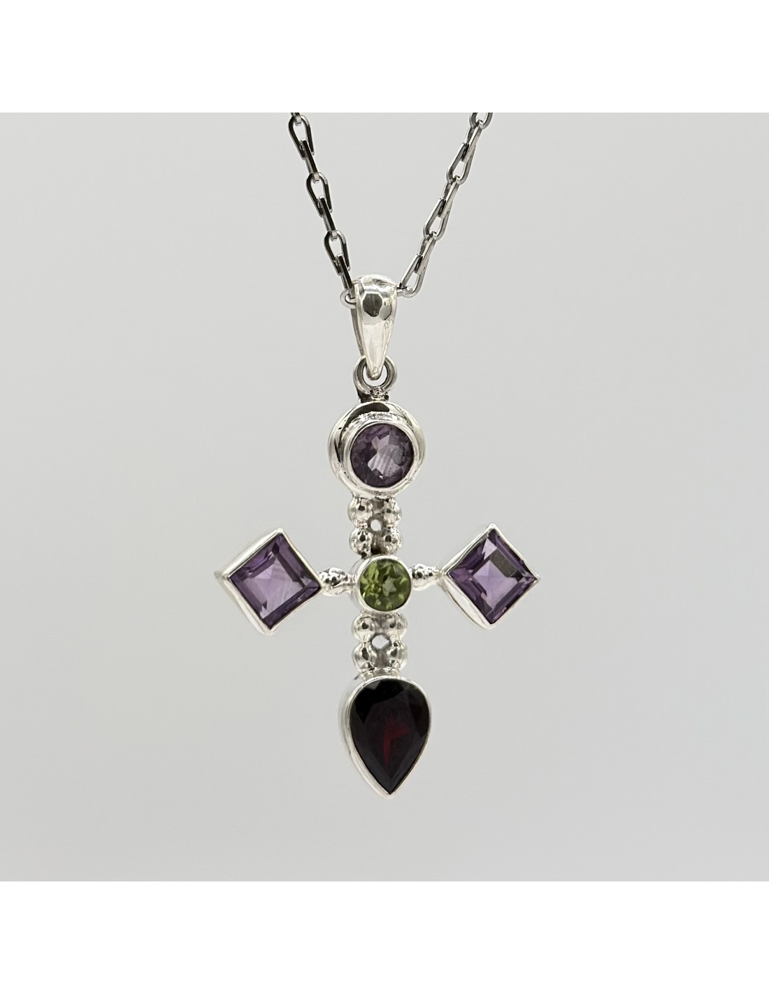 Colgante en cruz con amatista, granate y olivino en plata para protección espiritual
