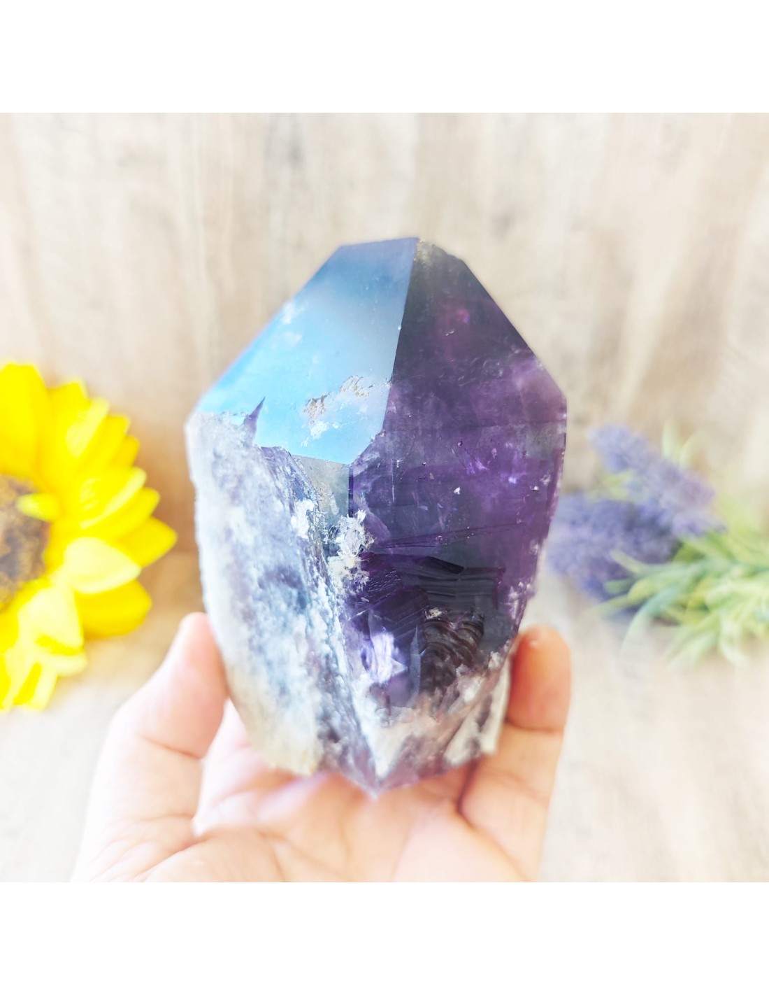 A ponta de ametista atua como um canal de direcionamento energético, proteção espiritual e clareza intuitiva. A sua vibração orienta a energia para o alto, fortalecendo o sexto e o sétimo chakra e promovendo equilíbrio emocional e elevação vibracional.